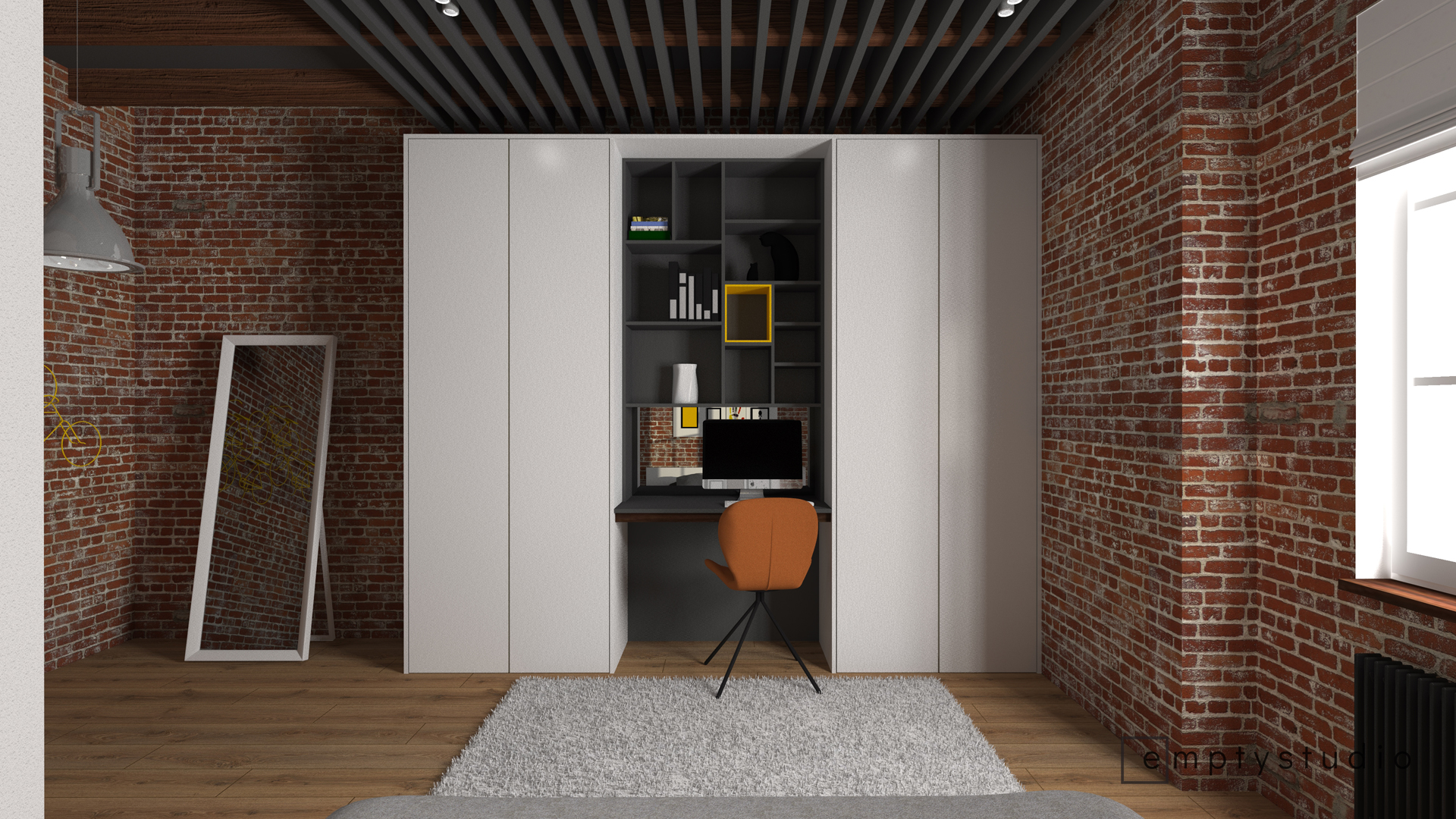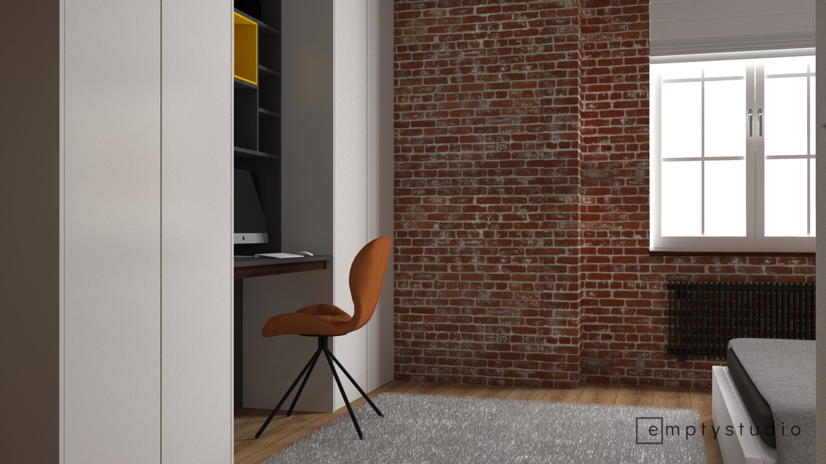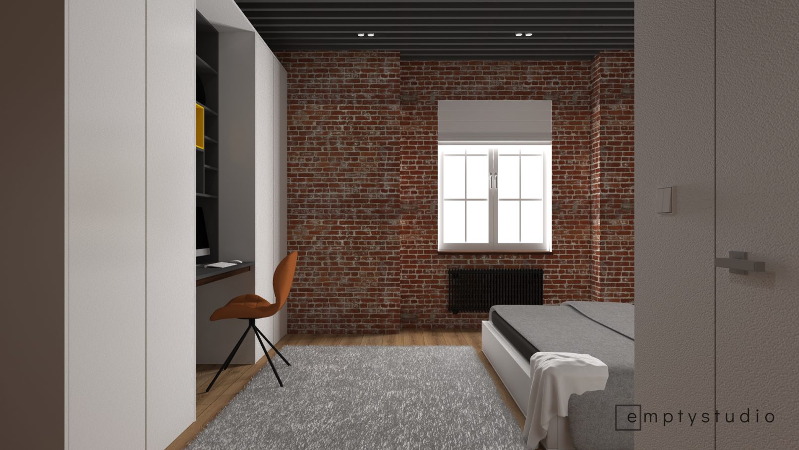 Kontrast pomiędzy surową, nadszarpniętą zębem czasu cegłą, a nowymi, minimalistycznymi w swojej formie i kolorystyce elementami. Główna funkcja sypialni została poszerzona o miejsce do korzystania z komputera, przeglądania internetu. Niewielkie biurko wkomponowaliśmy w jednolitą zabudowę, która mieści w sobie również garderobę.
