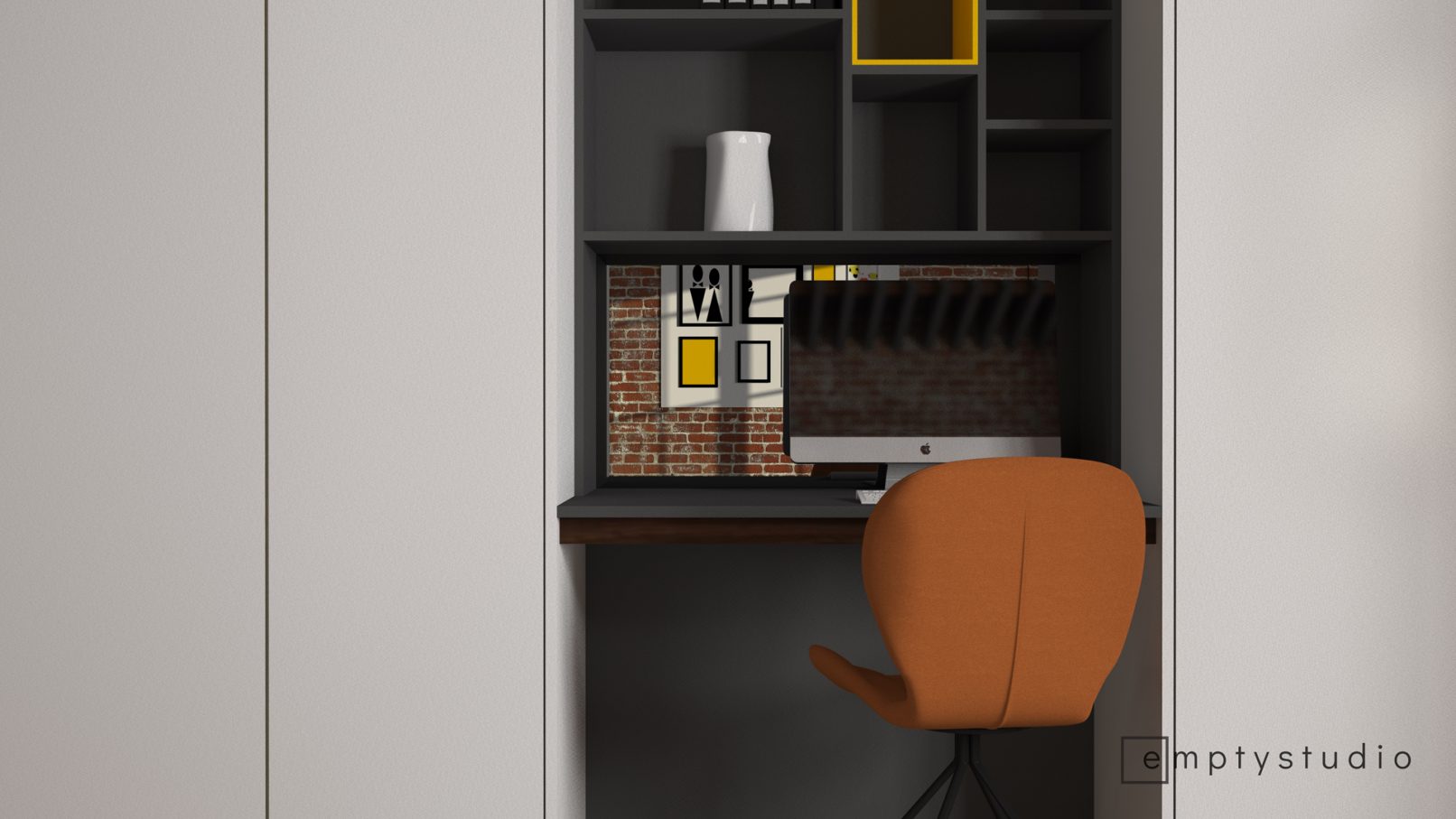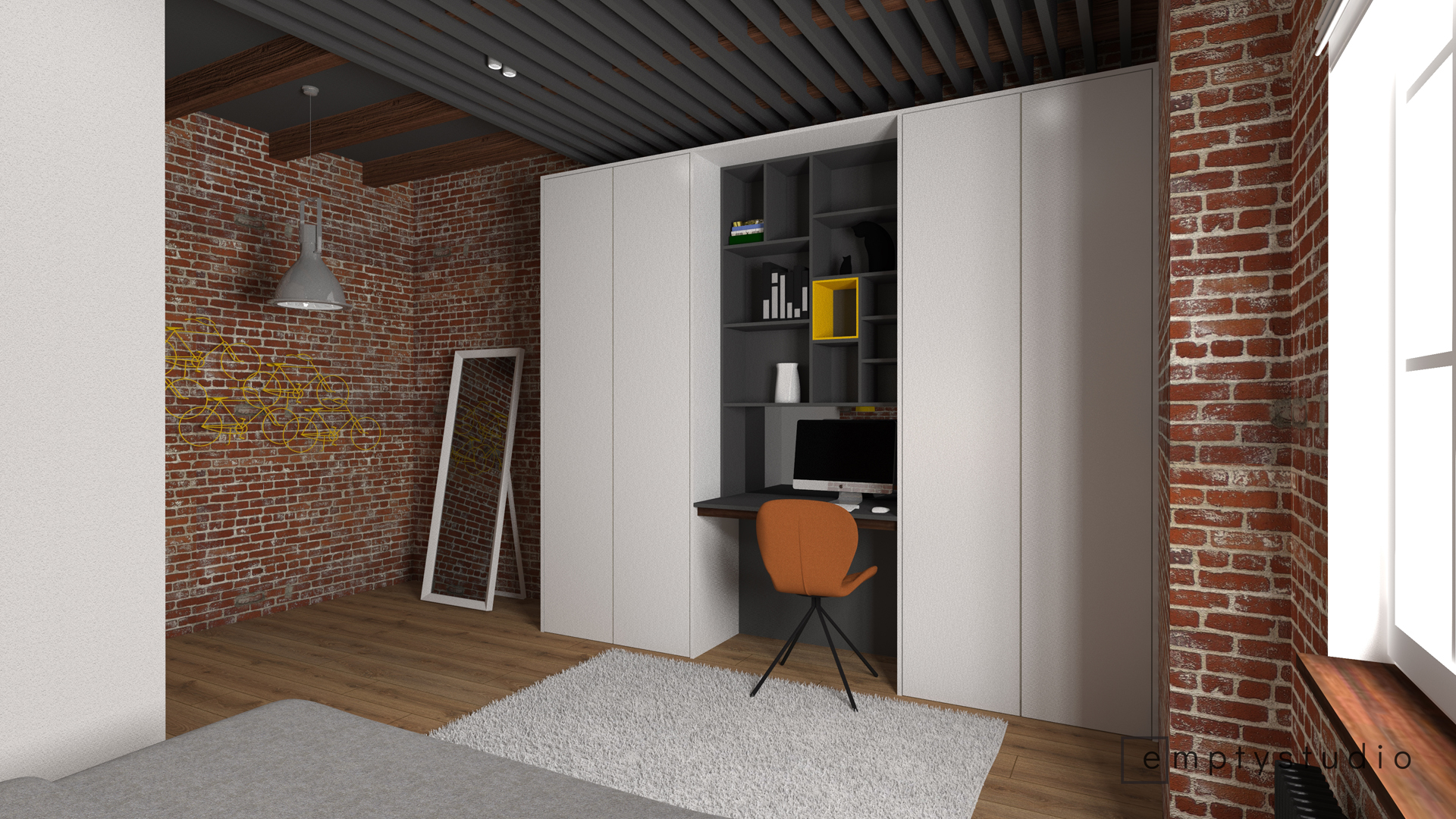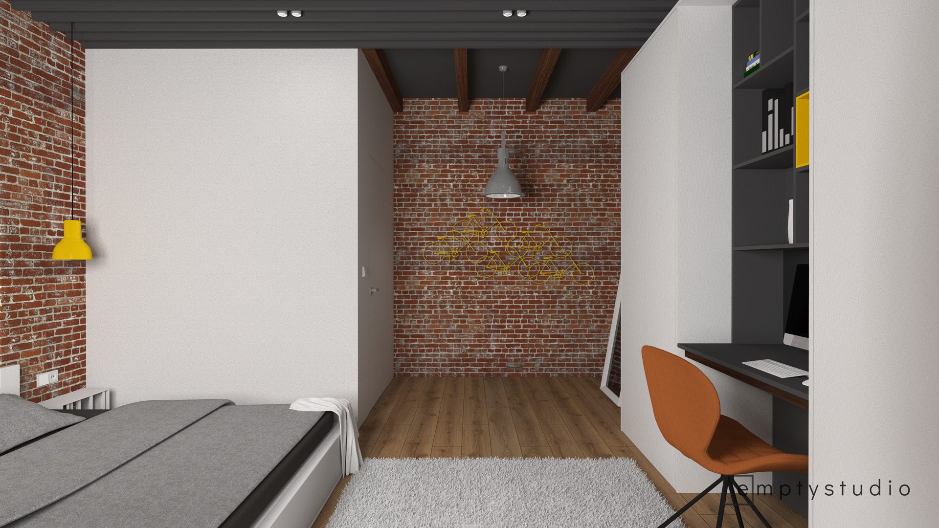 Kontrast pomiędzy surową, nadszarpniętą zębem czasu cegłą, a nowymi, minimalistycznymi w swojej formie i kolorystyce elementami. Główna funkcja sypialni została poszerzona o miejsce do korzystania z komputera, przeglądania internetu. Niewielkie biurko wkomponowaliśmy w jednolitą zabudowę, która mieści w sobie również garderobę.